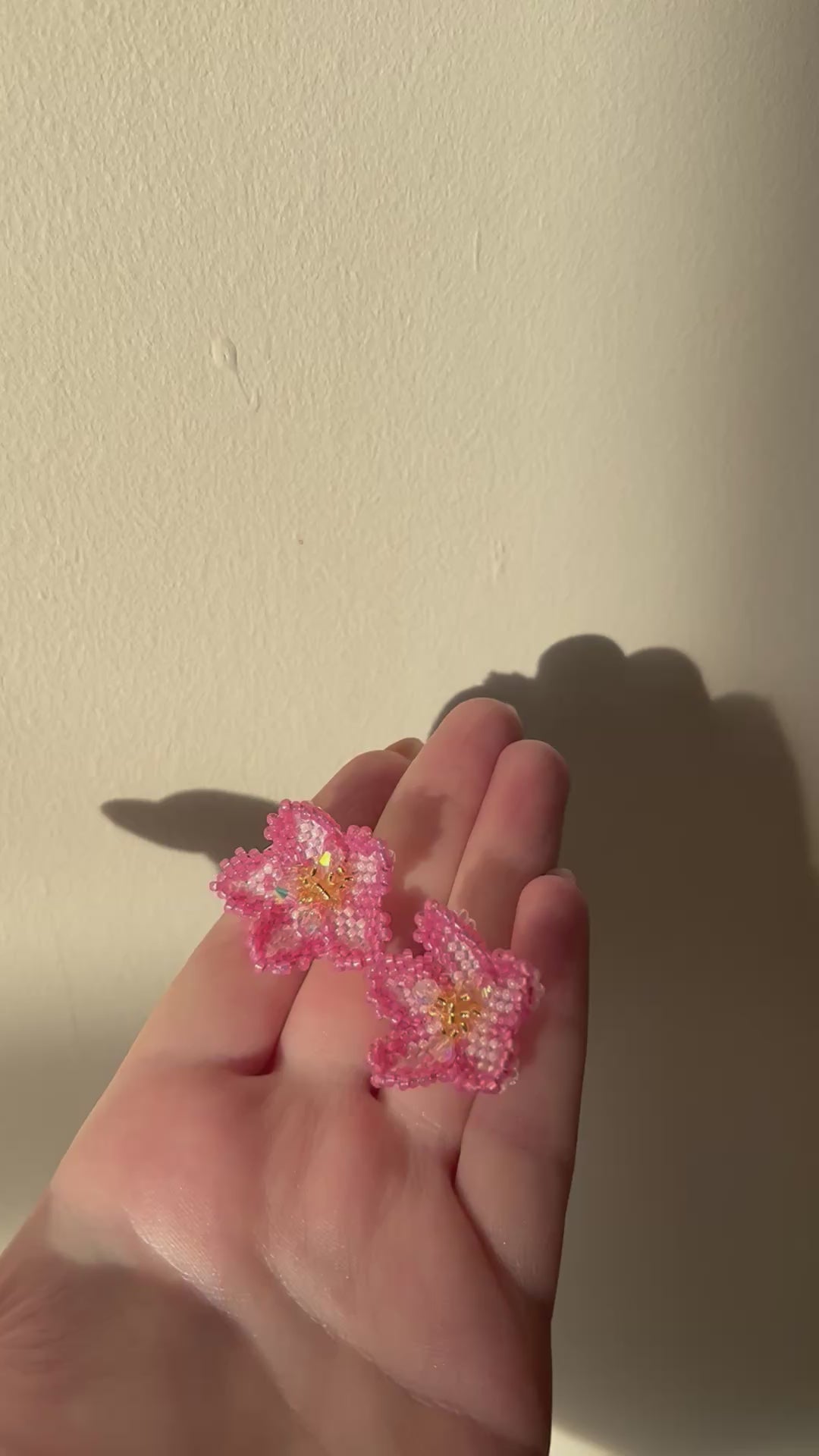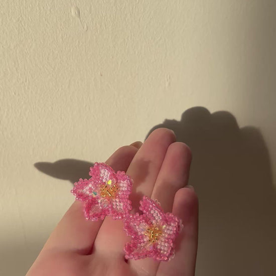 Inspired by cherry blossoms these earrings are so whimsical with the perfect colour combinations of dusky rose and pale pink with a gold beaded centre and faceted glass pollen.